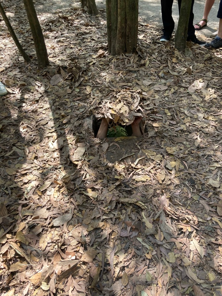Continuing the war theme, I embarked on a tour of the Cu Chi tunnels, where the Viet Cong dug an elaborate series of tunnels near US bases to smuggle both arms and soldiers and to attack the Americans. There, the guide showed us the many booby traps used to capture US soldiers and the ingenious entrances to the tunnels: