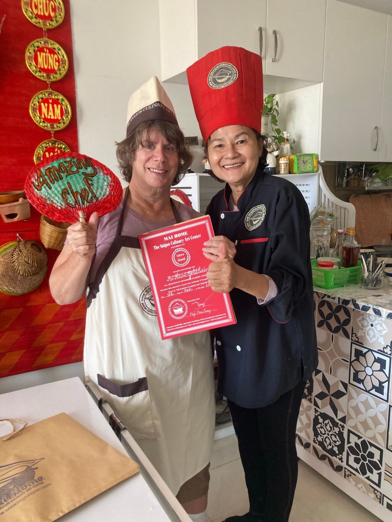 Having had enough of the War, I joined Qwi for a Vietnamese cooking lesson. It was held in the kitchen of a high rise apartment block; she had lost her restaurant during the pandemic. She was a great teacher and we made spring rolls, Vietnamese pancakes and the iconic Vietnamese dish, pho. All were delicious.