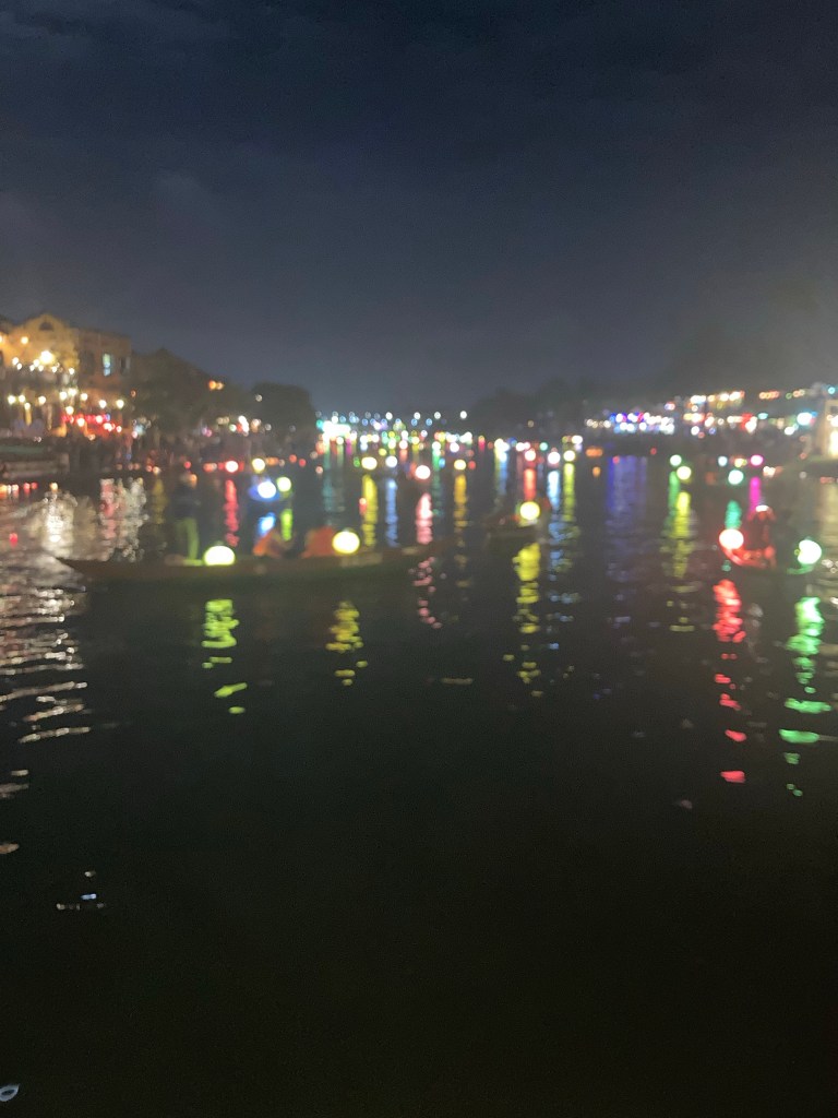 The lantern festival, held monthly on the first night of the lunar calendar, was dreamed up by the Hoi An tourist board. Basically, you buy a lantern for about $1, light the candle, make a wish then set it on the water and watch it sail away. I, along with thousands of others, couldn’t resist: