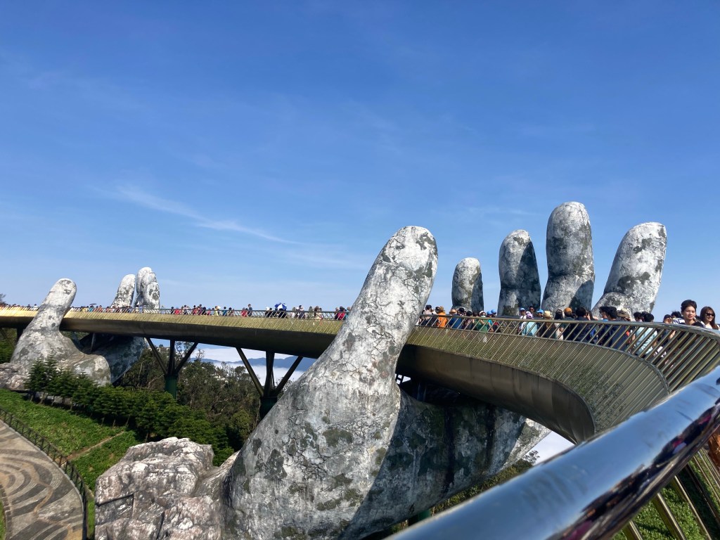 The French used to be carried up there by the Vietnamese; today the world’s longest single rope cable car whisks you up in about 10 minutes and the newest attraction- The Golden Bridge- comes into view:
