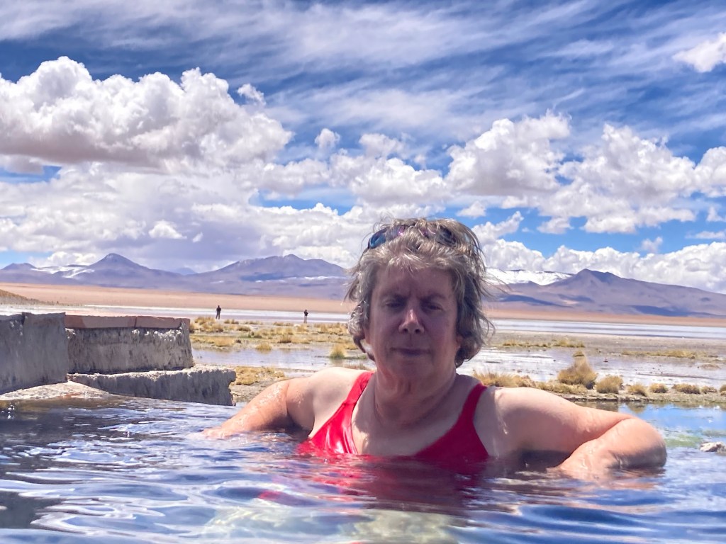 Since the whole area was formed by volcanoes, geysers and hot springs abound. Our tour stopped at a hot spring and I changed into my bathing suit and melted into the very hot water: