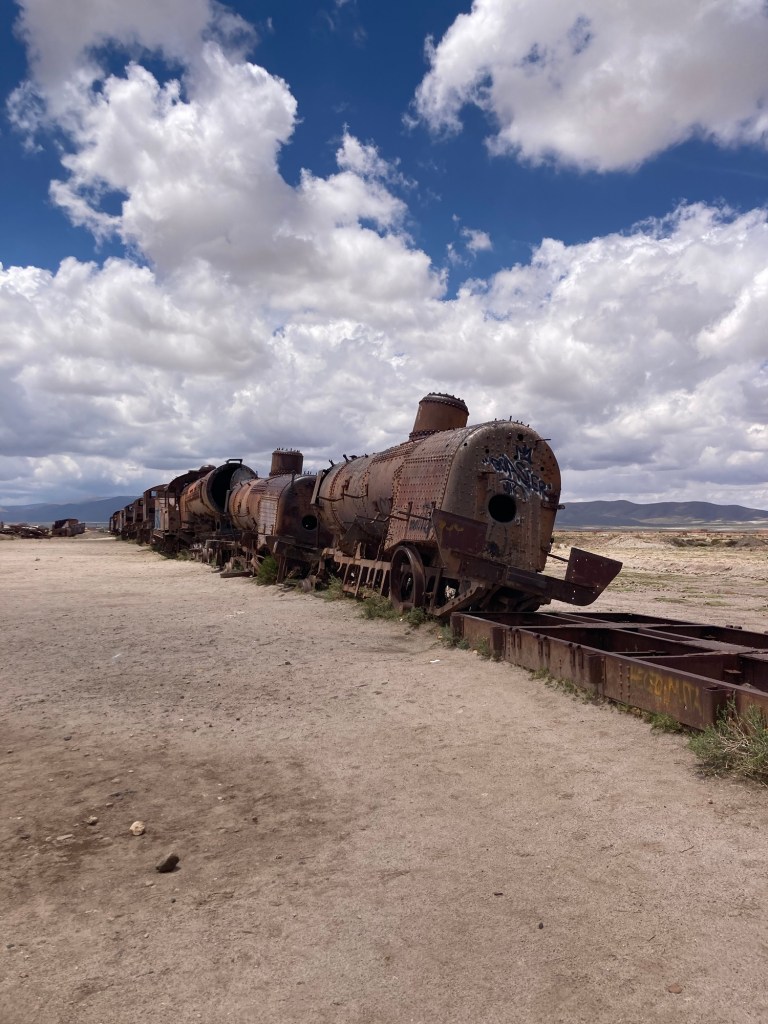 A few hours later we drove to the town of Uyuni where we stopped at the train cemetery, a collection of rusty, dilapidated locomotives and other train carriages: