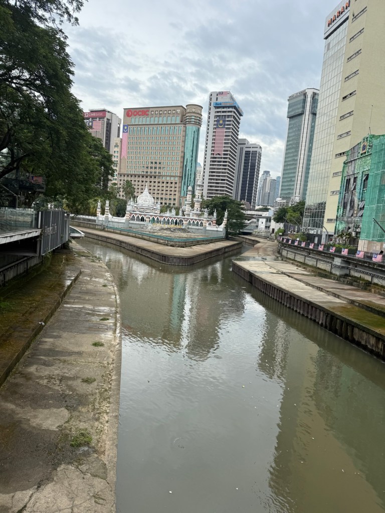 We stopped at the place where the Klang and Gombak Rivers meet. A few hundred years ago, two tin minors met at its confluence and founded the city of Kuala Lumpur, which means where the muddy rivers meet. Today, it’s quite polluted and low, fairly underwhelming.: