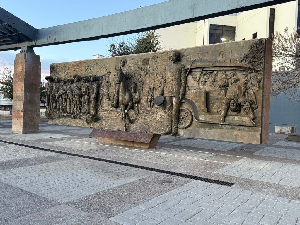 Our visit started in the capital city of Chihuahua, home to the famous Francisco Pancho Villa, an early 20th century revolutionary. Born into a peasant family, he developed a reputation as a modern day Robin Hood, trying to obtain justice for the dispossessed indigenous tribes who lived in the area. He was, at various times, a bandit, the governor of the state of Chihuahua, a potential candidate for the presidency of Mexico, the leader of an invasion into Columbus, USA, and a movie star who insisted upon acting in the title role of the movie made about him. Despite all these activities, he managed to have at least 25 wives. He was assassinated (by whom it is not clear) in 1923 and is revered in numerous monuments around Chihuahua, including three murals in the main square:
