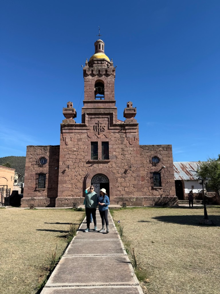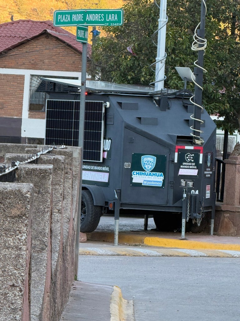 The reason for the heavy security in the church was explained by the guide who told us that in June, 2022, cartel members burst in and killed two priests and two bystanders. To this day, the murderers have not been caught. In the grounds are memorials to those killed. Across the street and beyond the fence was a Mexican military vehicle: