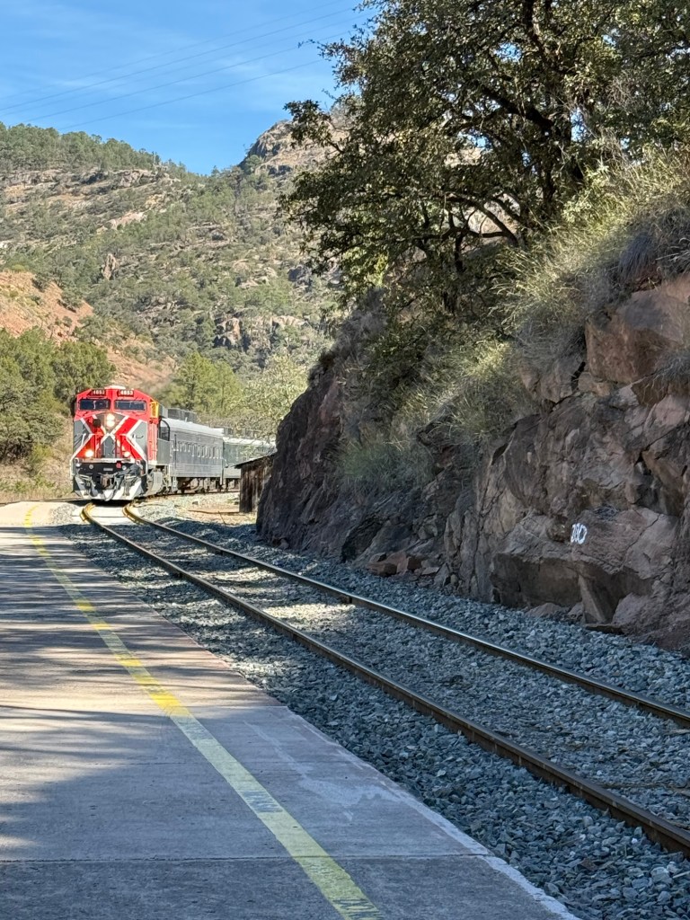 So, the next day, we were driven to the small train station at Bahuichivo to catch the Chepe Express train. The line was originally envisioned in the mid-19th century to run from Mexico’s Pacific Ocean all the way to Kansas City, USA. Politics, economics and the engineering difficulty of constructing a railroad in the canyons and mountains quickly thwarted this dream.