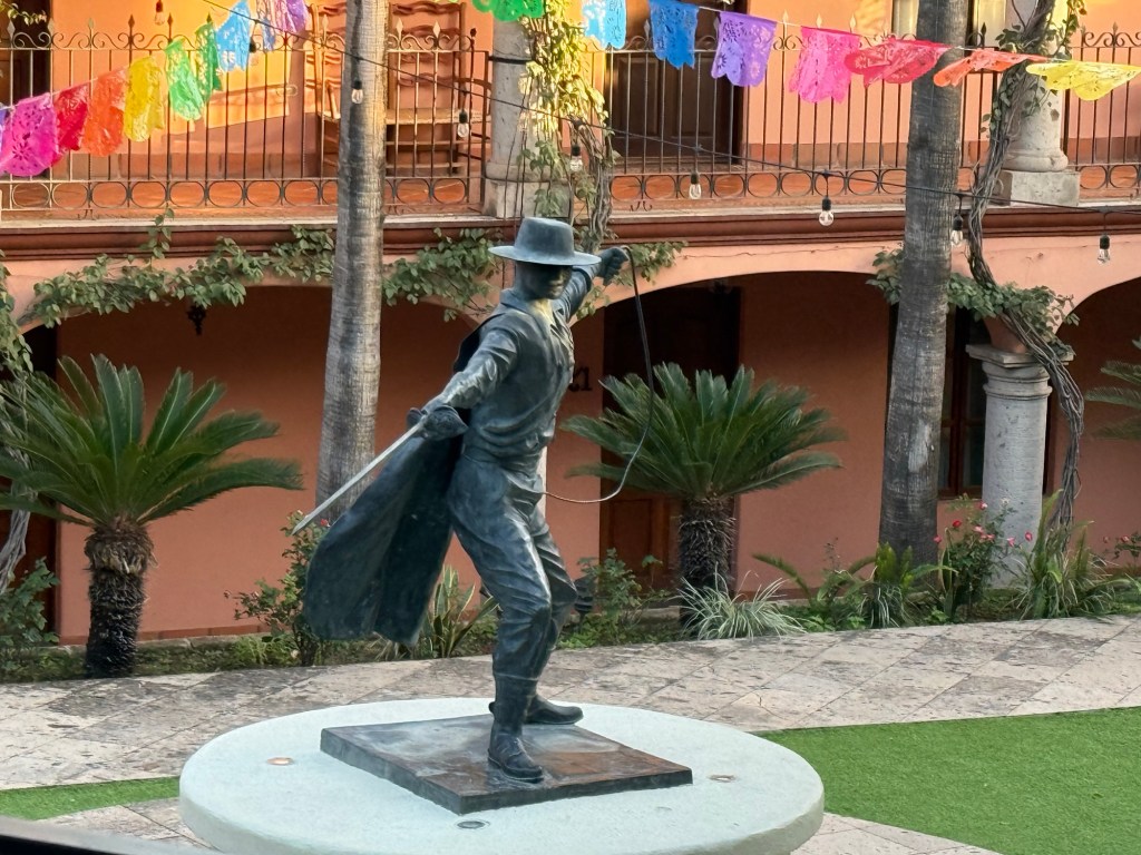 Our hotel in El forte was the final Balderama, Hotel, the Posada Hidalgo, famous for being the birthplace of Don Diego de la Vega, a wealthy merchant son who moved to California and was at the forefront of the revolution against the Spaniards and their treatment of the poor. It is said he often donned a mask and was the inspiration for the fictional Zorro. A statue of Zorro is in one of the courtyards at the hotel: